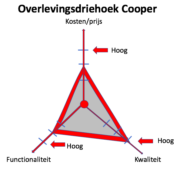 Volgens Cooper moet van tevoren bedacht worden of het product de concurrentie aankan. Cooper zoekt de concurrentie op met de confrontatiestrategie. Er zijn 3 eigenschappen die zowel vanuit de onderneming als vanuit de klant bekeken kunnen worden. Deze 3 eigenschappen die in de overlevingsdriehoek zitten zijn: kostprijs van het product, productkwaliteit en functionaliteit van het product. Dit betekent dat elk van de drie genoemde eigenschappen een bepaalde positie moet innemen binnen de overlevingsdriehoek om het product te laten slagen. Buiten de overlevingsdriehoek slagen de producten niet. Volgens Cooper is het voor een bedrijf schadelijk als zij op alle drie de eigenschappen proberen de beste te zijn. Het is beter om twee eigenschappen in de overlevingszonde te houden en met één uit te blinken.
